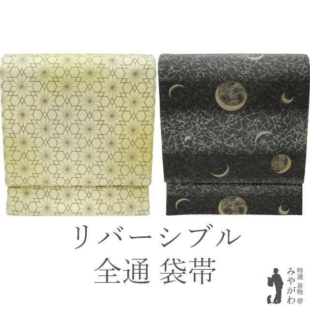 【新品】 袋帯 リバーシブル リサイクル 正絹 全通 両面 薄黄緑 × 黒 グリーン系 ブラック系 桜 花 月 三日月 金糸 銀糸 染め 織り カジュアル かわいい お洒落 春 秋 冬 美品 仕立て上がり みやがわ sb54594