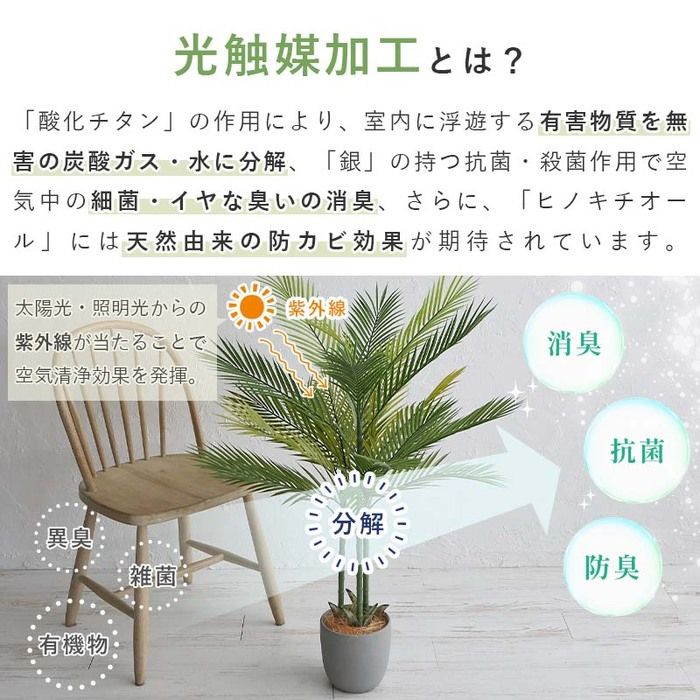 アレカヤシリアルなのにお手入れ不要!光触媒加工で空気をきれいに置くだけおしゃれなフェイクグリーンサイズ 約W27×D27×H170cm 器のみ:21x19cm材質 ポリエチレン、スチール、セメント生産国 中国梱包 ダンボール箱梱包サイズ 240ご注意※ご覧のモニターの環境、撮影環境により実物と色味が異なって見える場合が御座います。※酸化チタンx銀xヒノキチオールによる光触媒加工を施しています。※本商品は植物ではありません。水やり不要です。※サイズ、形状、色の濃淡が個々に異なる場合があります。※梱包には細心の注意を払っておりますが、万一不自然な形になっている場合には手直しをお願いいたします。※茎や花の茎先にスチールピックが付いていることがあります。怪我をしないようお取り扱いにはご注意ください。※品質管理に万全を期しておりますが、まれに配送時の動きにより花や葉が落ちてしまうことがあります。繊細な商品のためどうしても避けられません。 取れてしまった場合は市販のボンド・アロンアルファー・グルーガン等で接着が可能です。※直射日光・火気・暖房器具の熱の当たる場所はお避け下さい。色あせ等商品劣化の原因となりますのでおすすめできません。※ホコリによる汚れは、柔らかい布やハタキなどで取り除いて下さい。色あせ、型くずれ、サビの原因になりますので、水洗いはおすすめできません。※お客様都合によるご返品、ご交換は出来かねますのでご了承くださいませ。
