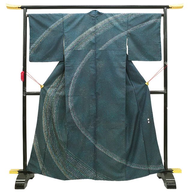 こちらのお品は、紺グレー地に青緑色でたたき染めが施されています。