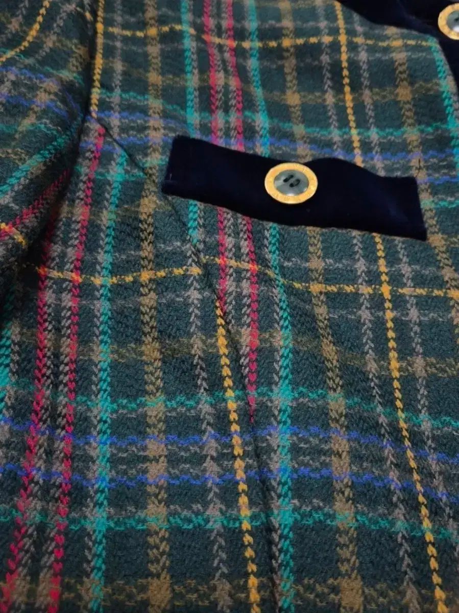 このウール100%のジャケットは、緑、赤、青、黄色をブレンドしたもので、最近では見られないチェック柄が施されています。