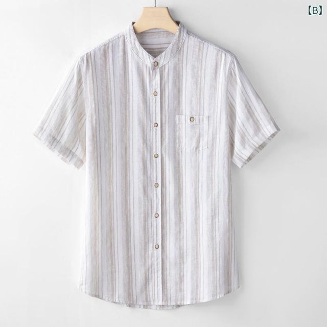 メンズ ファッション 服 男性用 オシャレ シンプル 大人 かっこいい 大きいサイズ ストリート 紳士服 夏 縦縞 リネン 半袖 シャツ カジュアル スタンド レトロ 綿