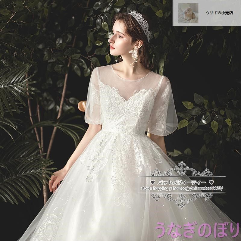 ウェディングドレス 二次会 結婚式 披露宴 ブライダル ロングドレス 花嫁 パフスリーブ ウエディングドレス Aライン オフホワイト 編み上げ サイズオーダー