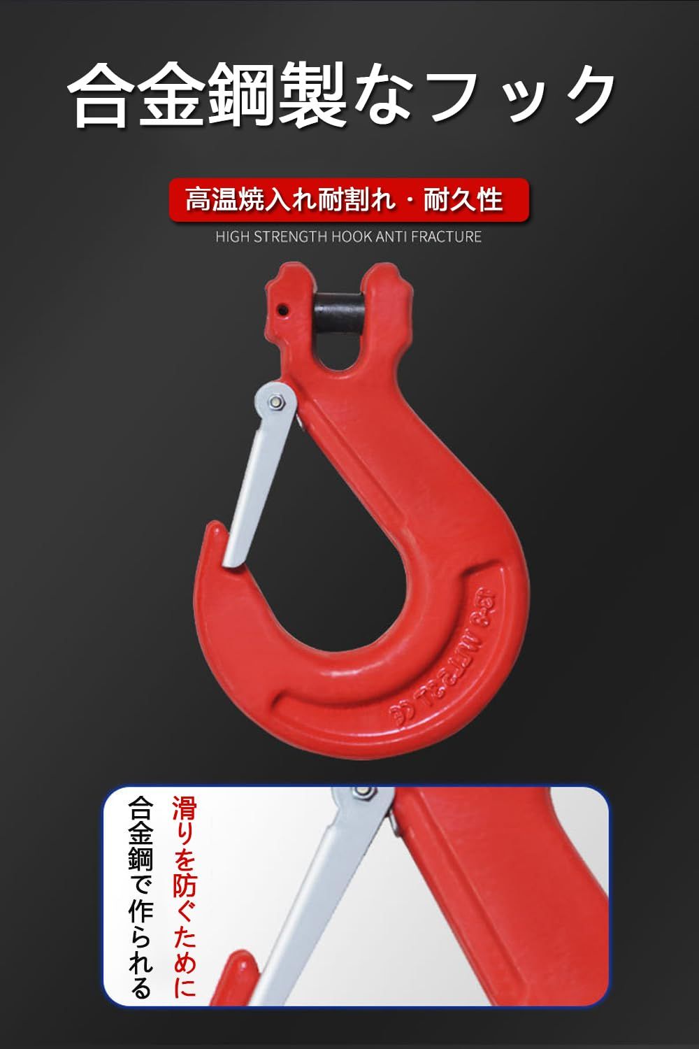 【強靭性・摩耗性に富み】合金鋼材質G80で作られたチェーン、チェーンの表面には亜鉛メッキが施されで長寿命化を実現しました。