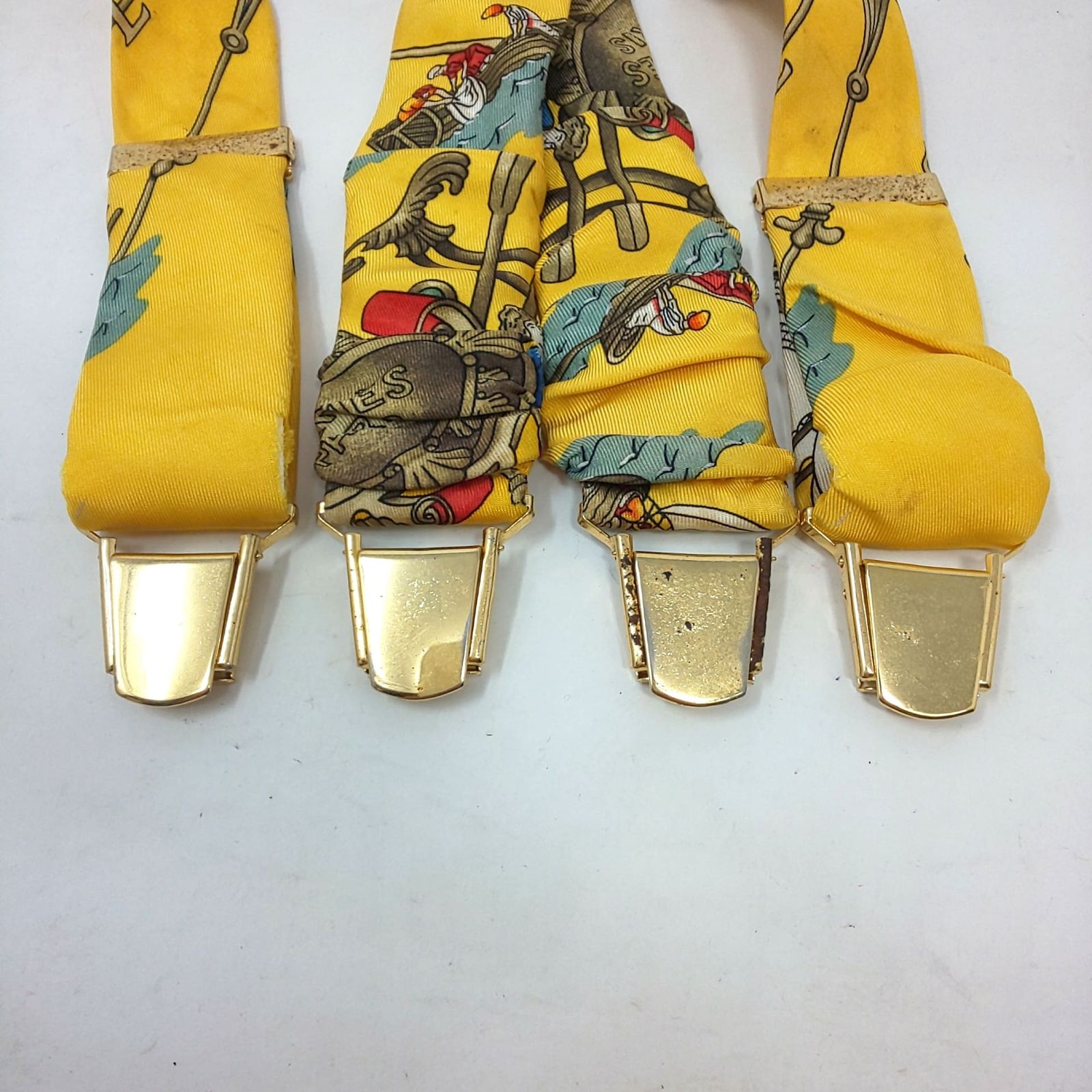 970 B-03 HERMES エルメス シルク サスペンダー レザー 総柄 イエロー系 ゴールド金具 ブランド 服飾雑貨