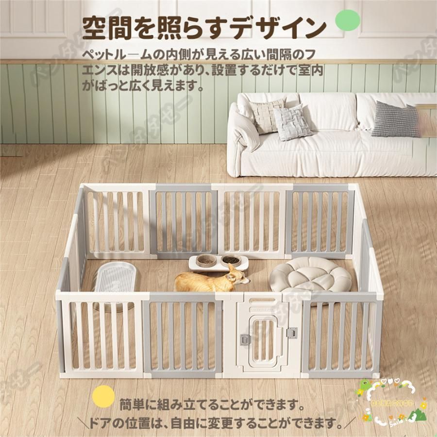 特徴:ペットサークル、ペットゲート、ベビーサークル、ベビーゲート、キッズルームとしてマルチに使えるおしゃれなベビーサークル。工具なしで簡単に分解できるので折りたたみ式ベビーサークルのように小さく収納できます。ドアの位置は、自由に変更することができます。
