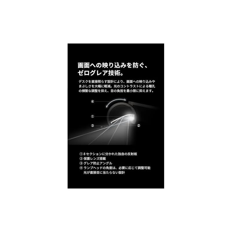 【画面に光が当たらない非対称設計】独自の光学設計と反射板により、光は手元のみを照射。18°の角度設計でモニターへの映り込みや眩しさを防ぎ、目の疲れを和らげます。