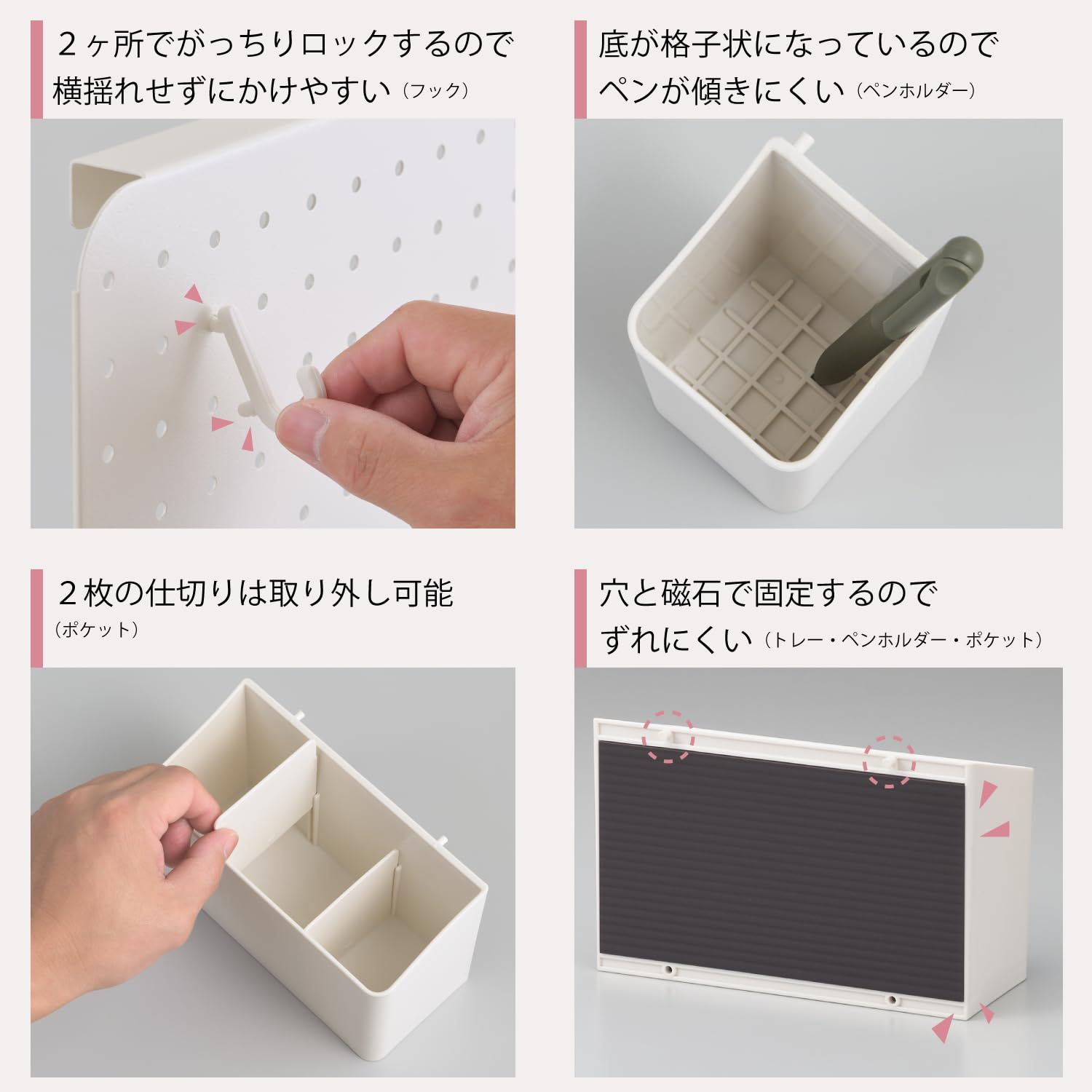 ・フック×2、ペンホルダー×1、ポケット×2が付属。市販のマグネット用、有孔ボード用パーツも使用できるので、お好みの収納を作っていただけます。
