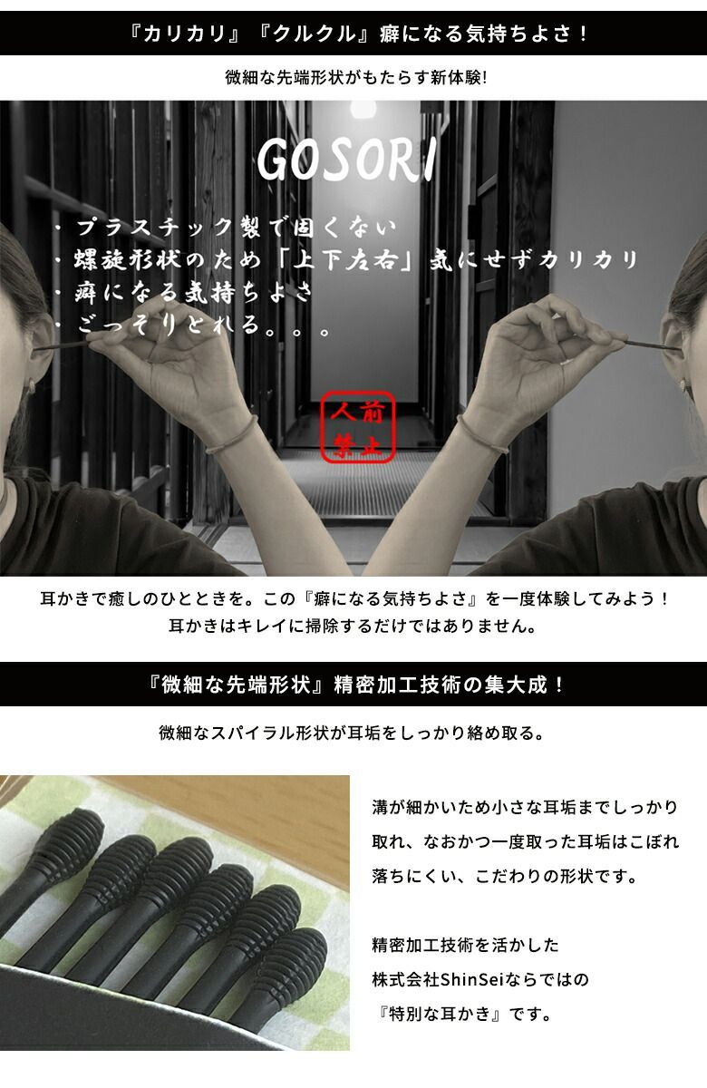 商品説明:射出成形メーカーである株式会社ShinSeiが開発した「人前では使ってはいけない耳かき -GOSORI-」です。螺旋形状のため「上下左右」気にせず『カリカリ』、『クルクル』、癖になる気持ちよさ!環境問題に配慮したエコ商品。再生プラスチックを使用しています。『微細な先端形状』精密加工技術の集大成!微細なスパイラル形状が耳垢をしっかり絡め取る。溝が細かいため小さな耳垢までしっかり取れ、なおかつ一度取った耳垢はこぼれ落ちにくい、こだわりの形状です。