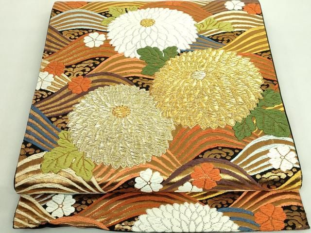 平和屋着物 上 西陣 河合美術織物謹製 六通柄袋帯 唐織 立波菊花文 黒地 金糸 kh 5