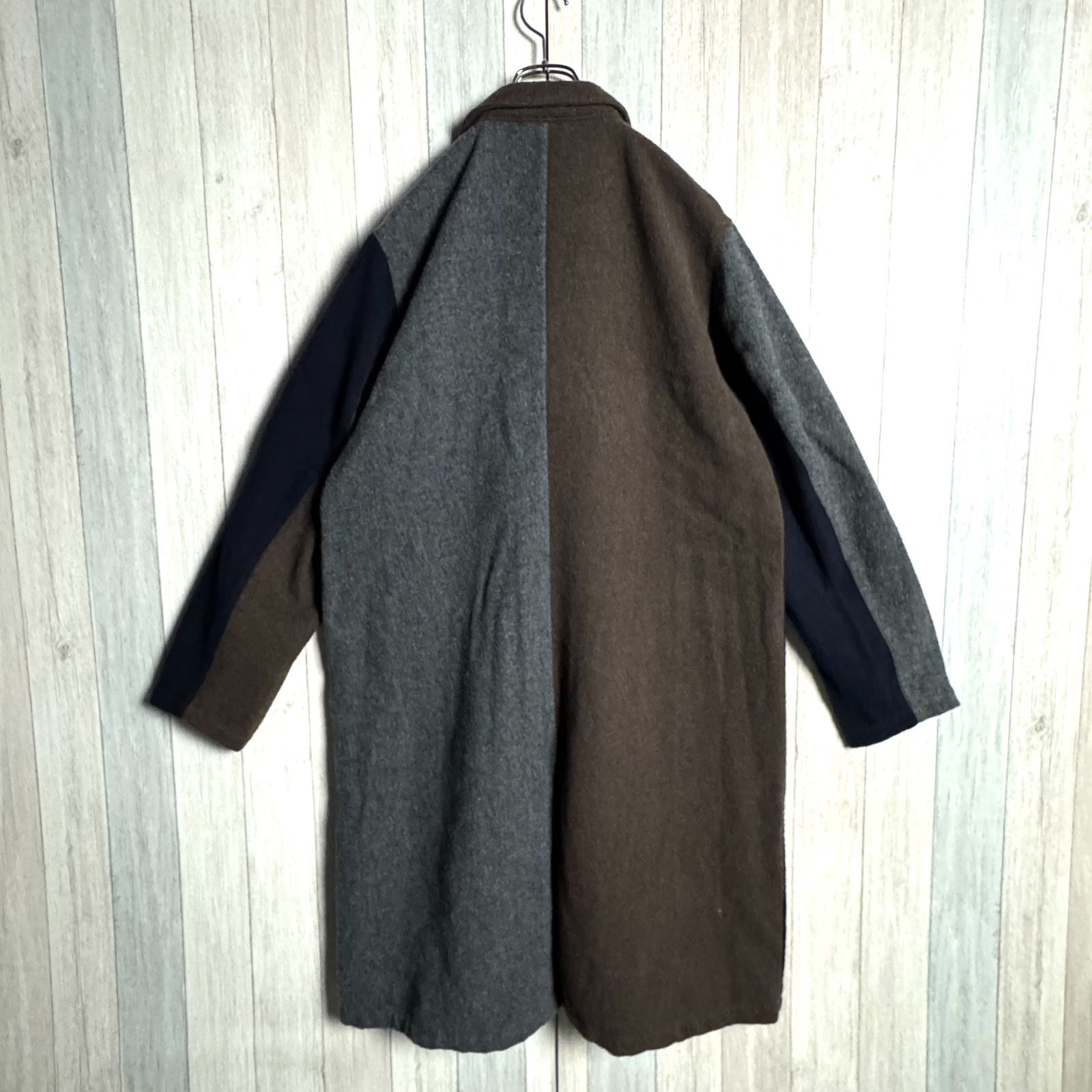 独特のクレイジーパターンが特徴的なこのウールコートは、シンプルながらも個性的なデザインが魅力です。