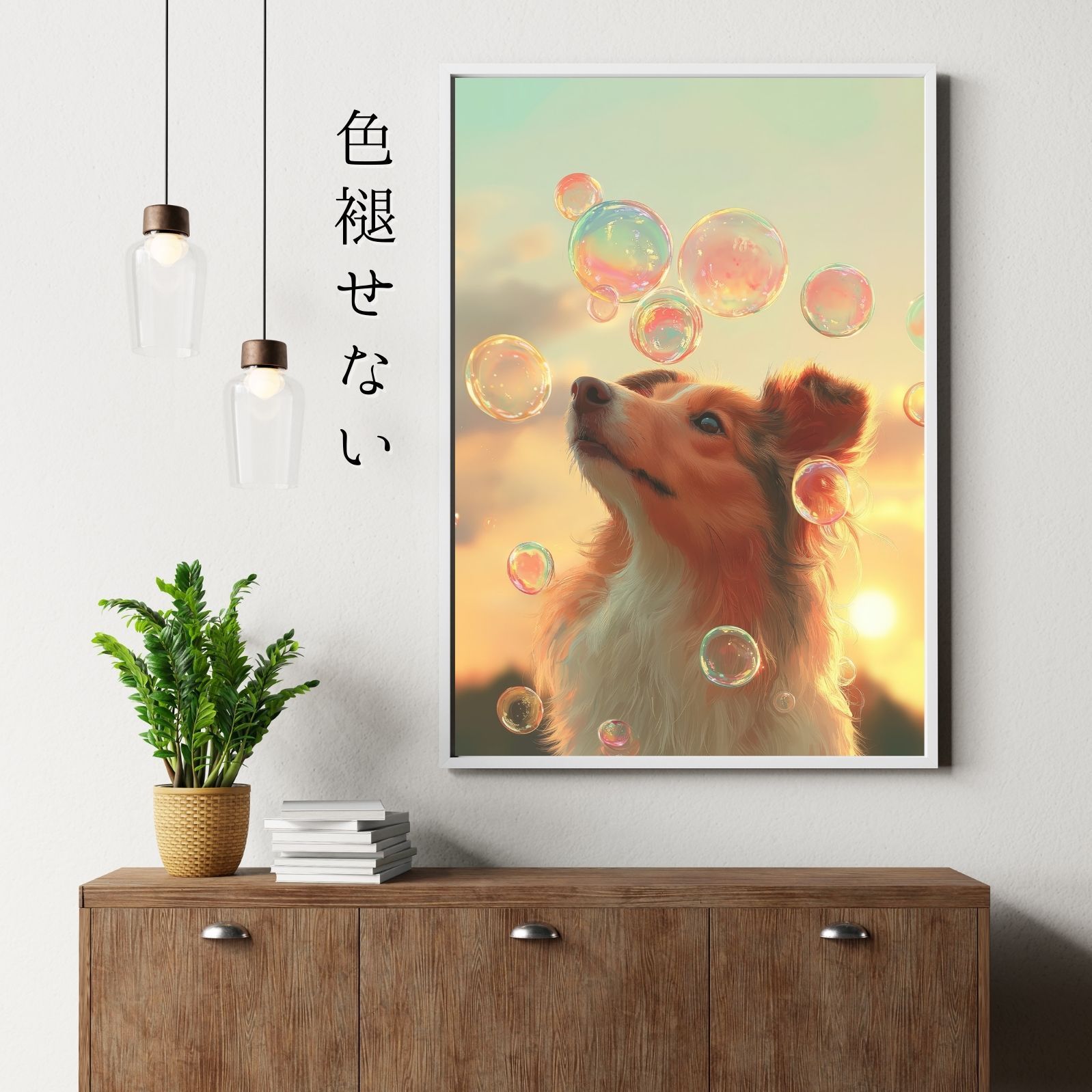 かわいいラフコリー・シェルティー犬が、空に舞うシャボン玉を見つめる愛らしい瞬間を切り取ったアートポスターです。