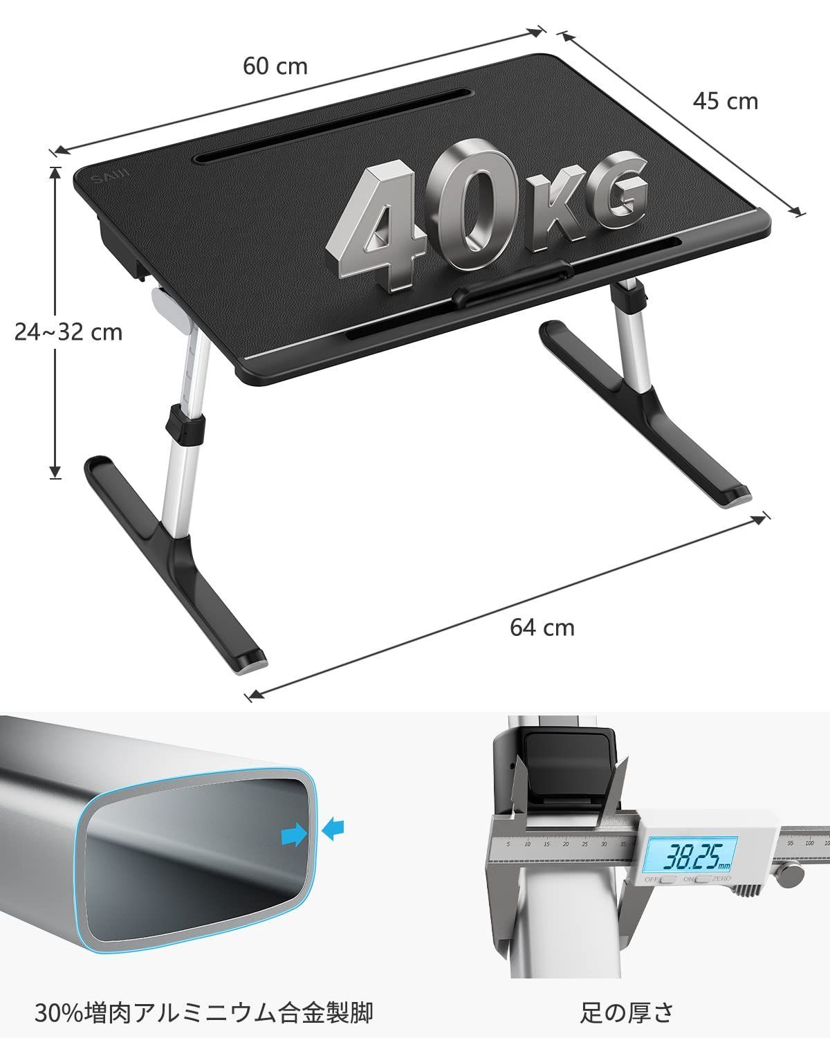 「デスクのサイズ」:幅60x奥行45x高さ39cm、折り畳んだ厚み8cm、テーブルの天板厚み1.3cm、本体重量3kg、耐荷重40kg。
