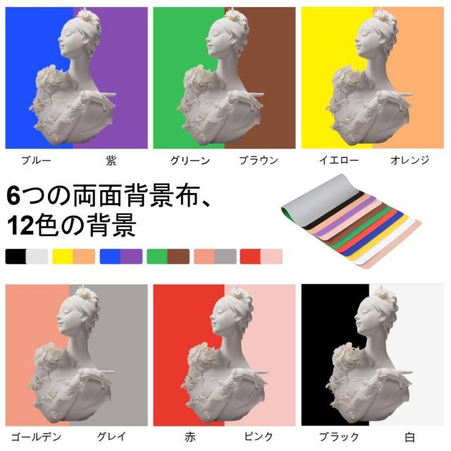 【マルチカラー背景布】異なる色の6つの取り外し可能な背景紙、合計12色が付属しています。異なる撮影シーンやテーマのニーズを満たし、より創造的なスペースを提供します。