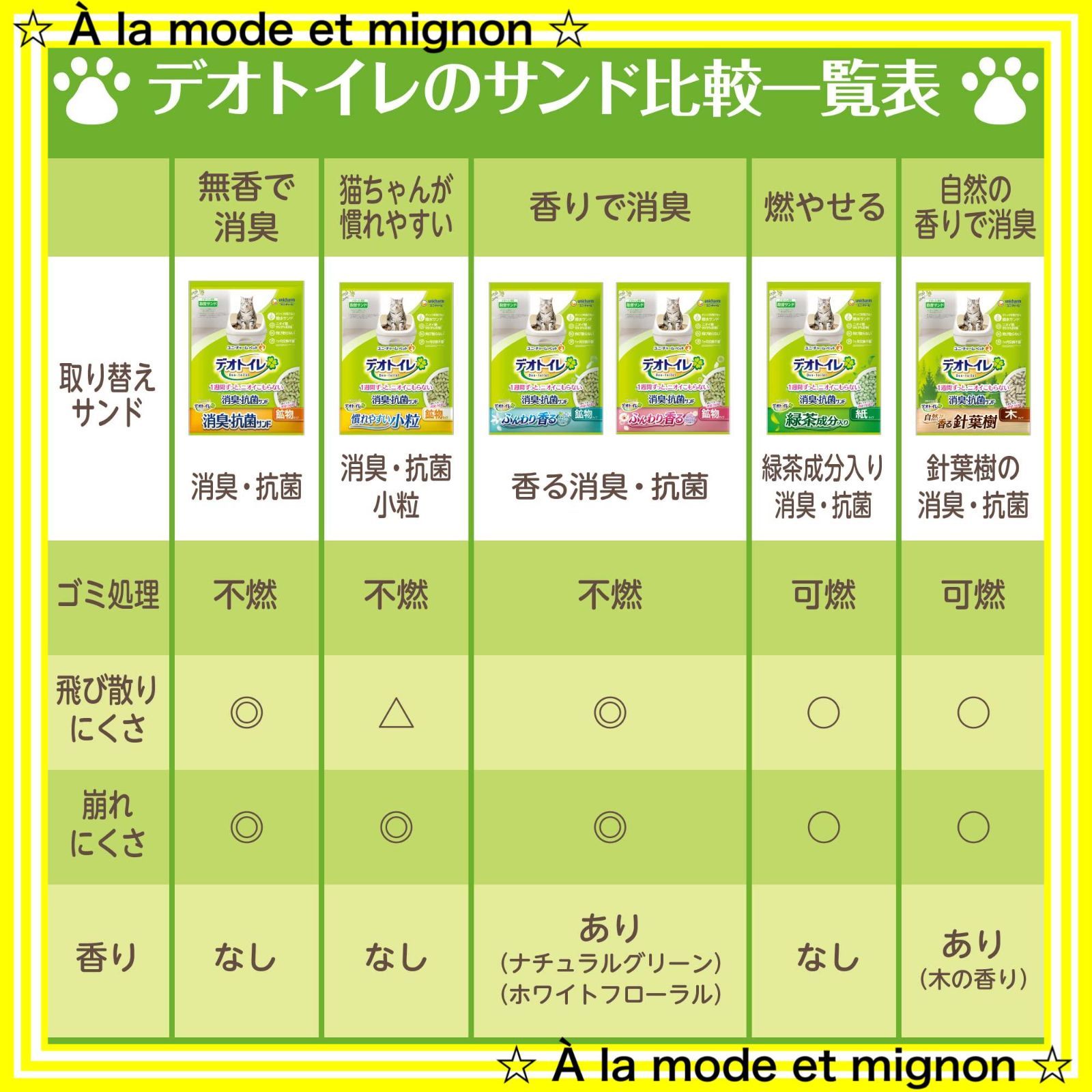 ・サンド表面にオシッコ汚れを残さず通過し、ニオわない*1 ・紙タイプだから、可燃ゴミで処理OK ・1ヶ月不要*2 ・飛び散りにくく、転がりにくい形状*3 *1オシッコ汚れとはサンド表面に残ったオシッコ液のこと *2愛猫1頭(体重8kgまで)のデオトイレ使用時。ウンチをした場合は早く取り除いてください *3デオサンドオシッコのあとに香りで消臭する砂比