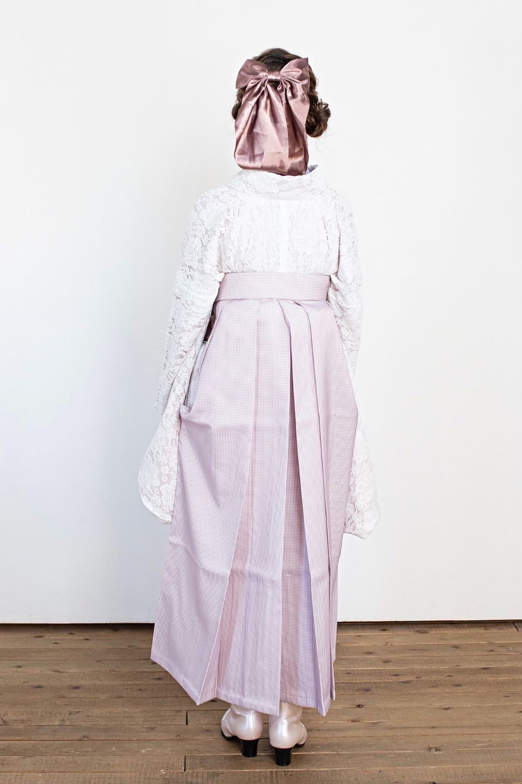 着物ジェンヌ 卒業式 袴3点セット レース二尺袖 白×くすみピンク チェック柄袴