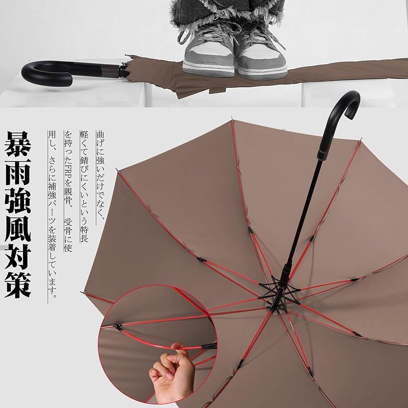 【★豪雨&台風対抗の長傘★】:わざわざ台風、暴風雨の天気の為に工夫を凝らして設計した耐強風の傘骨となります。強い風にあおられても心強くて安心できる男性専用の紳士傘です。傘骨は柔軟で丈夫なグラスファイバーを採用し、二重構造に出来上がったので今までに無い強度と耐久性を実現しました。かなり耐久性に優れ、暴風雨、台風の天候でも容易に割れたり折れたりする心配がありません。傘の部分が強風で裏返っても元に戻ります。安易に折れたり曲がったりする心配ありません。