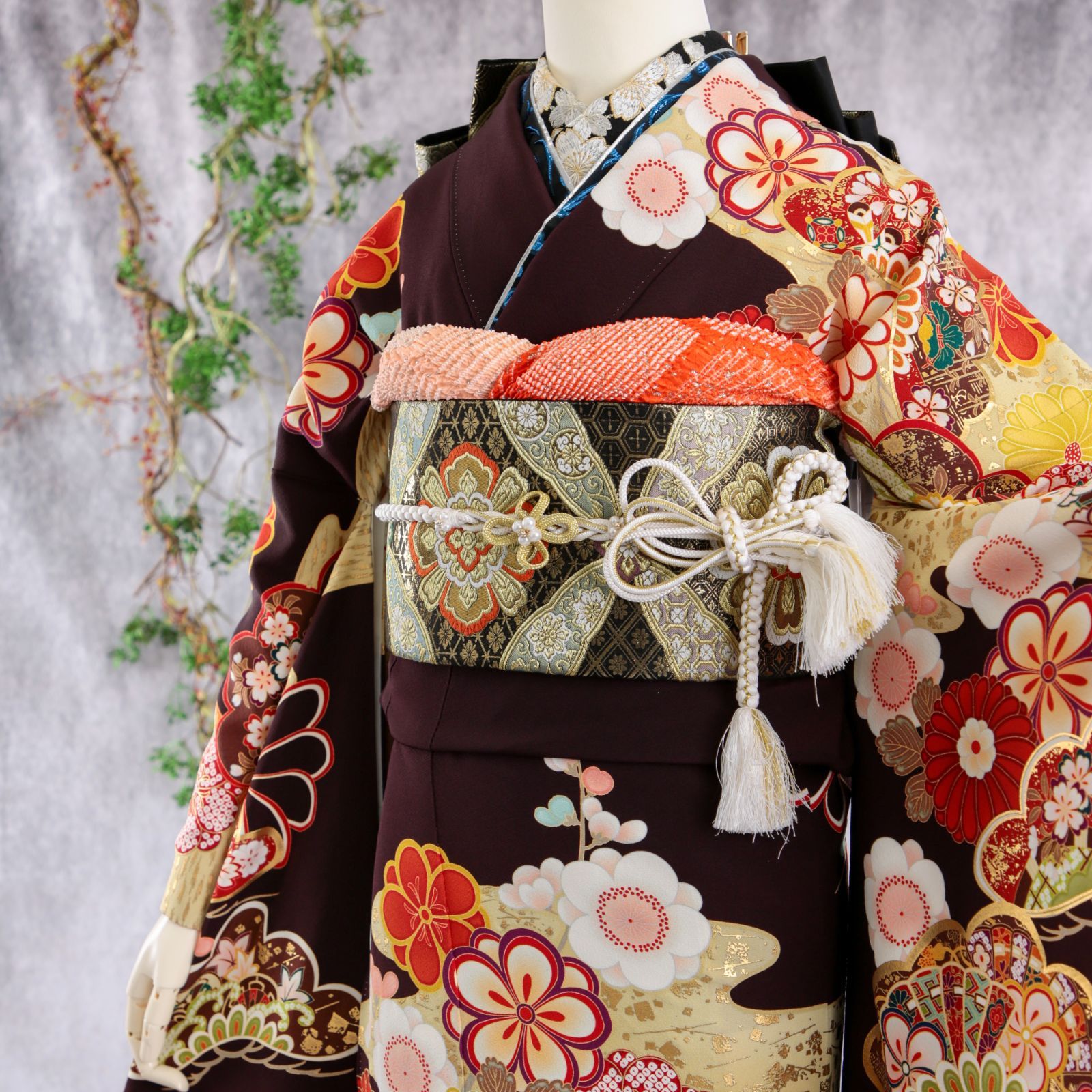 振袖フルセット 振袖セット 振袖 Lサイズ 茶× 典 成人式 着物 晴れ着 6点セット FN-445
