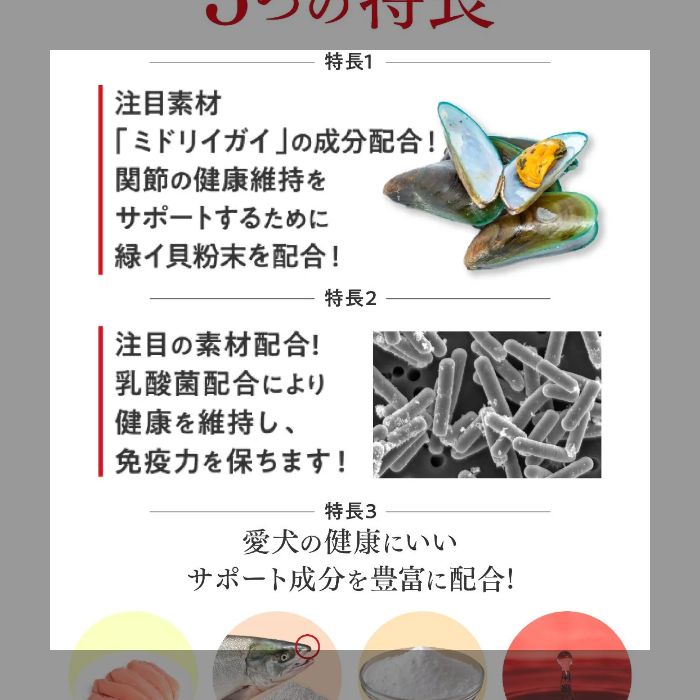 【18種類の食品添加物不使用&安心の自然派設計】香料・着色料・保存料など18種類の食品添加物を一切使用せず、愛犬の健康を考えた無添加処方。素材の自然な美味しさを活かし、安心して与えられます。