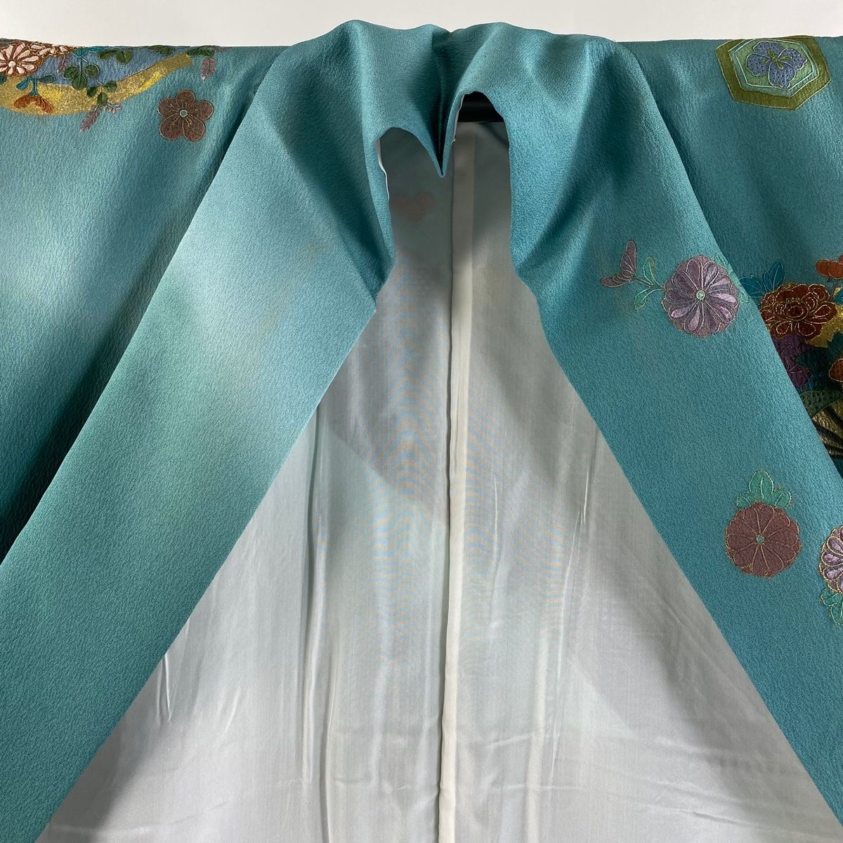 訪問着 身丈169 cm 裄丈68.5 L 袷 扇 御所車 刺繍 金彩 青緑 正絹