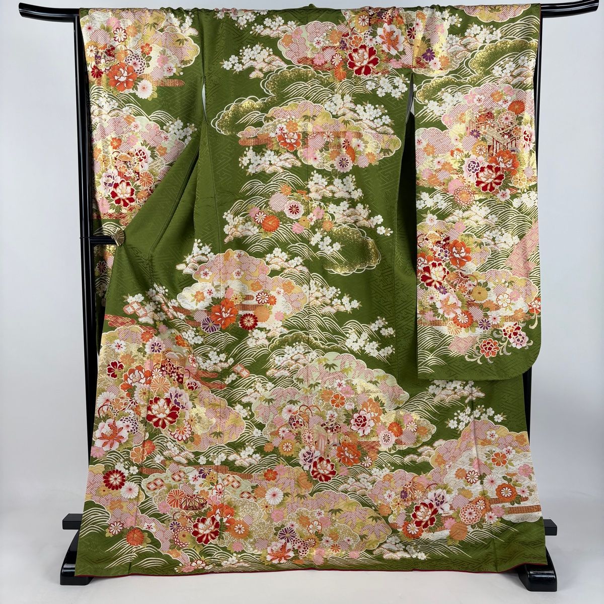 振袖 身丈173 cm 裄丈69 L 袷 貝桶 草花 金糸 金彩 よもぎ色 正絹