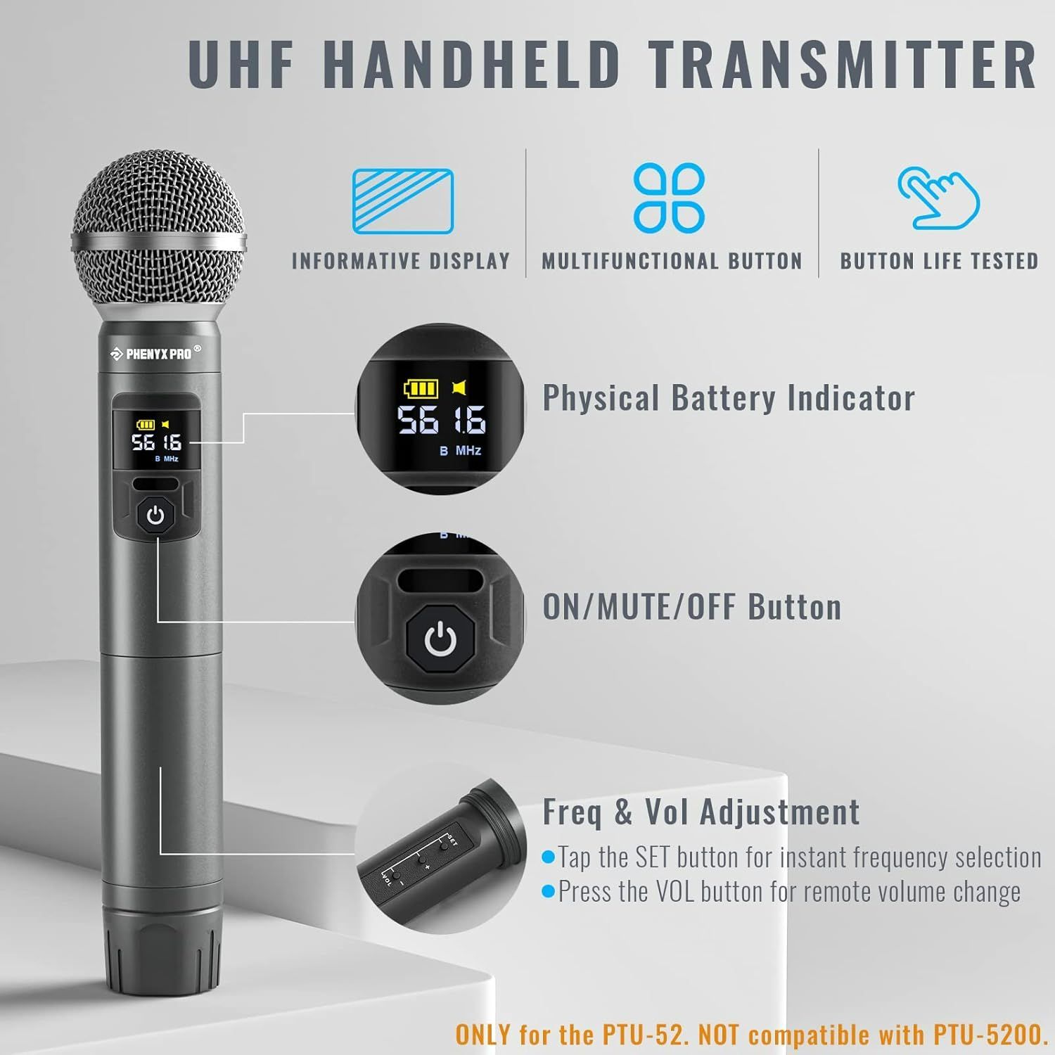 phenyxproワイヤレスマイクシステム 技適マーク&PSEマーク&日本語取扱い説明書付き メタルワイヤレスマイクセット ハンドヘルドコードレスダイナミックマイク 歌 カラオケ 教会用 2 x 30 UHF調整 周波数 200フィート範囲PTU-52-2 H