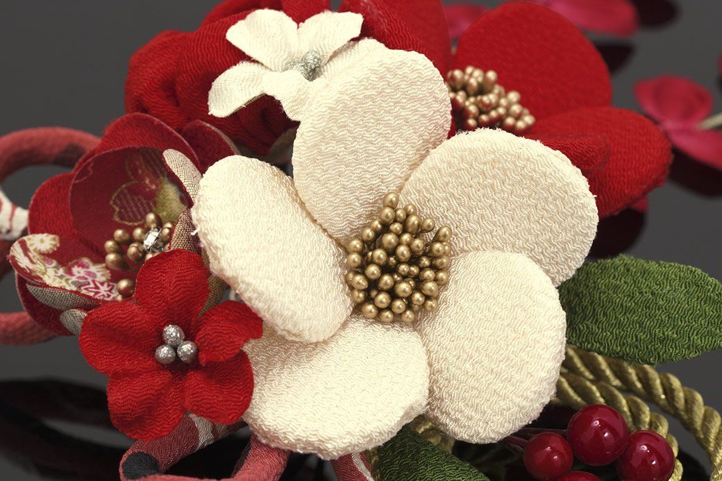 ふっくらとした縮緬の梅や椿の花がアレンジされています