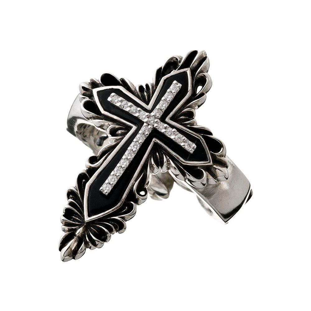 A commanding cross ring that balances presence with poise. A sleek jet-black onyx composite forms the backdrop, while a pavé of brilliant CZ traces the cross at center—crisp, luminous, and unmistakable. Sculpted arabesque motifs frame the silhouette with volume and bite; polished planes and darkened recesses sharpen the contrast so the sterling’s cool radiance and the monochrome palette read with refined authority.