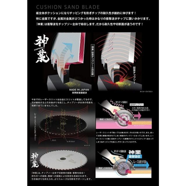 電動丸鋸木工用チップソー。(適合機種:充電式、集塵式)シルバーフッ素コーティング・高硬度ハイグレードチップを使用。世界初!クッションサンドブレード(0.5mm超薄合金2枚の中間に樹脂をはさんで圧着する構造)で衝撃、振動を吸収。超静音!!超制振!!世界初!クッションサンドブレードの音無刃は切断時刃先で受けた衝撃を本体全体で緩和し、チップの欠けを抑える効果があります。衝撃・振動低減で切断精度が向上して静音効果も高い。制振目的のスリットが無いため剛性が高くチップ摩耗時に発生する"引き曲り"も抑えられて切断をサポート。衝撃・振動低減は切断時の際の持ち手と機械への振動負担も低減されます。
