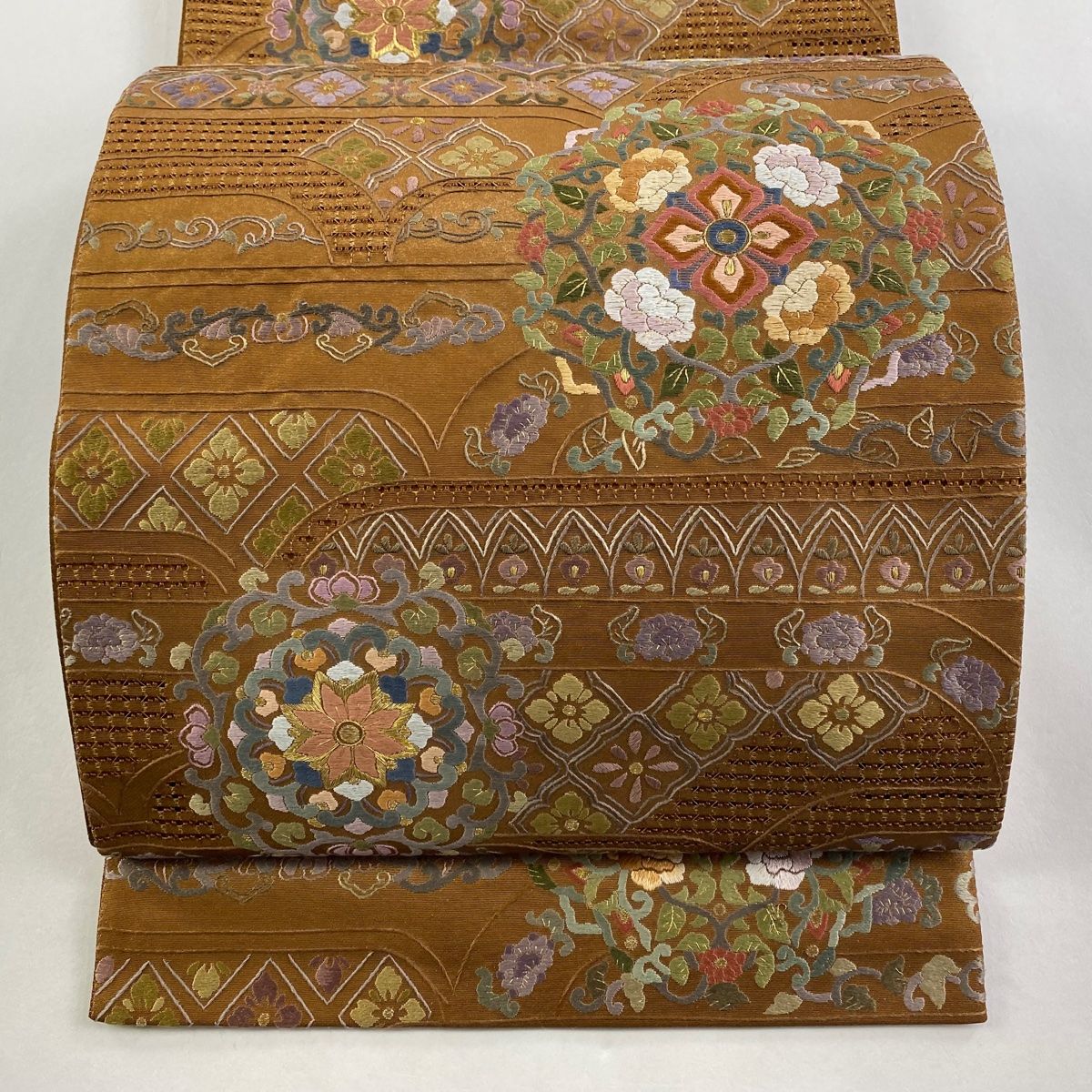 袋帯 華文 花唐草 金糸 刺繍 茶色 六通 正絹