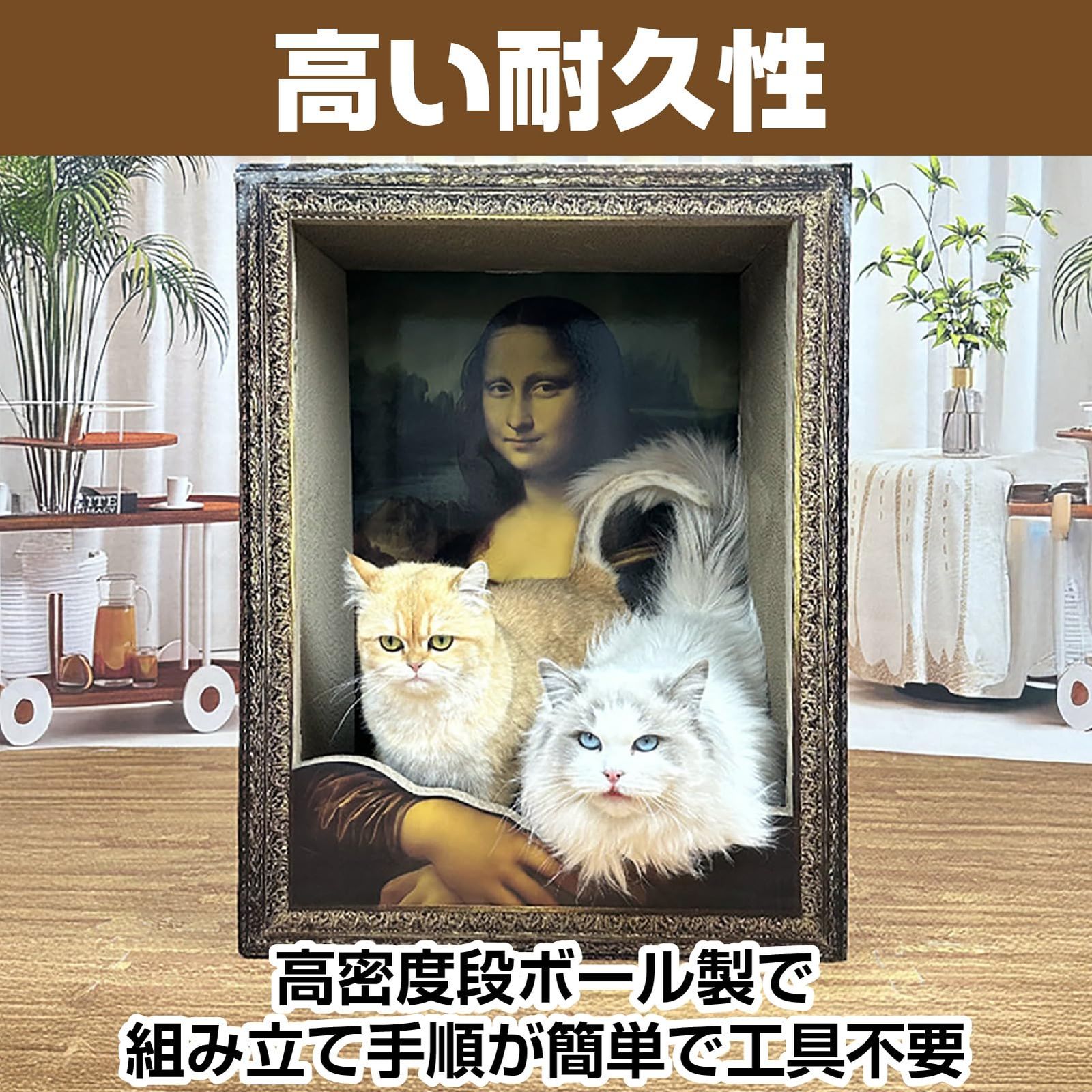 モナリザの肖像画を模したユニークなフレームに、猫が入るとまるで絵画の一部になる不思議なデザイン。SNS映え抜群で、インテリアとしても注目される話題の猫ハウスです。部屋に置くだけで美術館のような雰囲気に早変わり。猫好き&アート好きにはたまらない逸品です。【寝る・遊ぶ・爪とぎがこれ一つで完結】