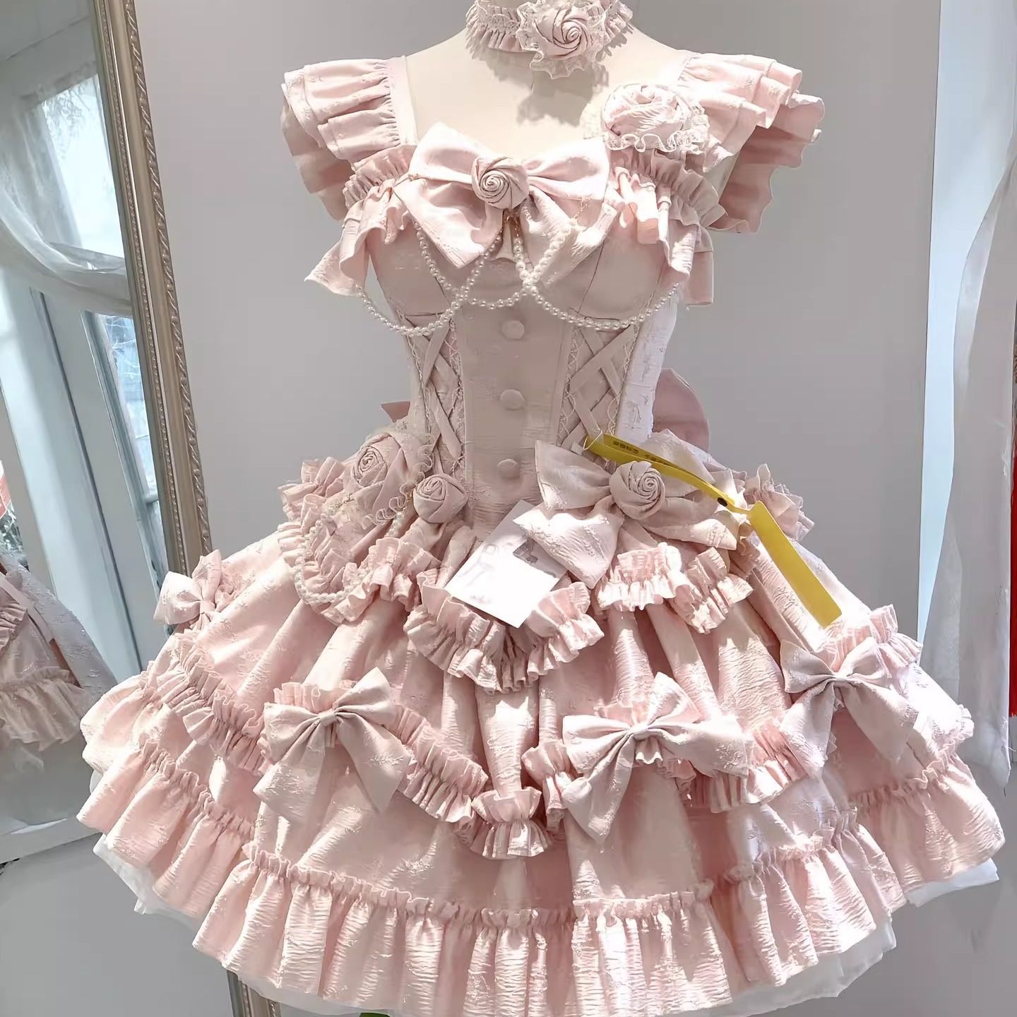 デザイン:華やかなレースが目を引くひざ丈ロリータドレス。甘さと上品さを兼ね備えたデザインで、特別な日のおしゃれを演出します。