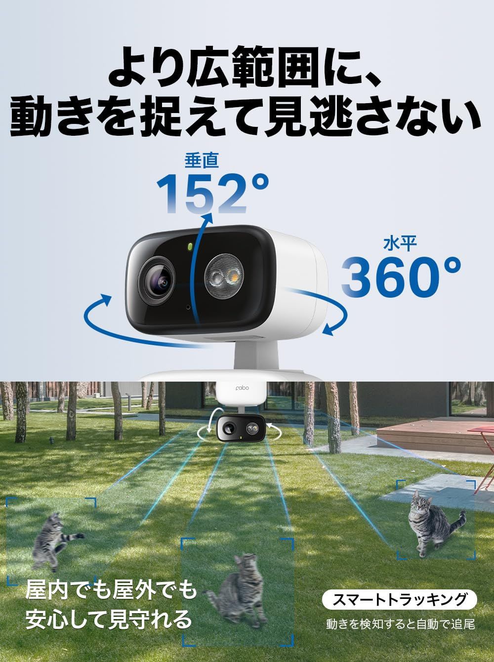 【パン・チルト機能】水平方向 360°、垂直方向152°の首振り機能搭載で、しっかり追いかけて、対象を捉えます。カメラの向きをアプリから自在に操作でき、広範囲の監視が可能です。