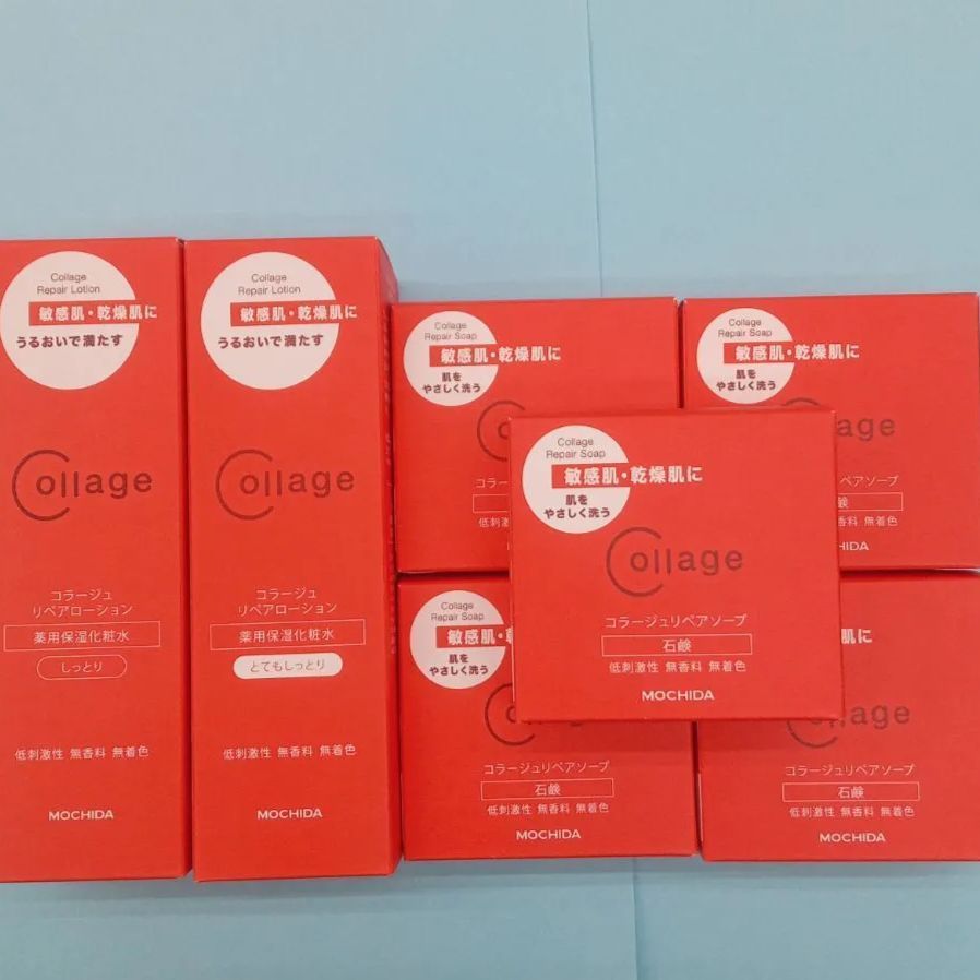 低刺激性スキンケア、コラージュリペアシリーズの保湿化粧水2個、ソープ5個の計7点セットです。