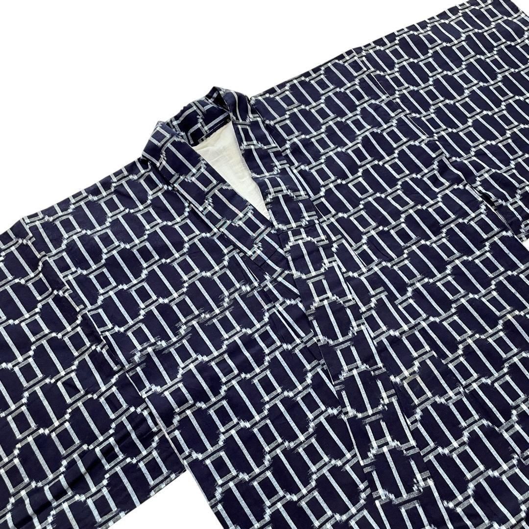濃紺の地に、幾何学柄が織り出された、カッコいい久留米絣、木綿絣の単衣着物です。(着物のみの出品です)