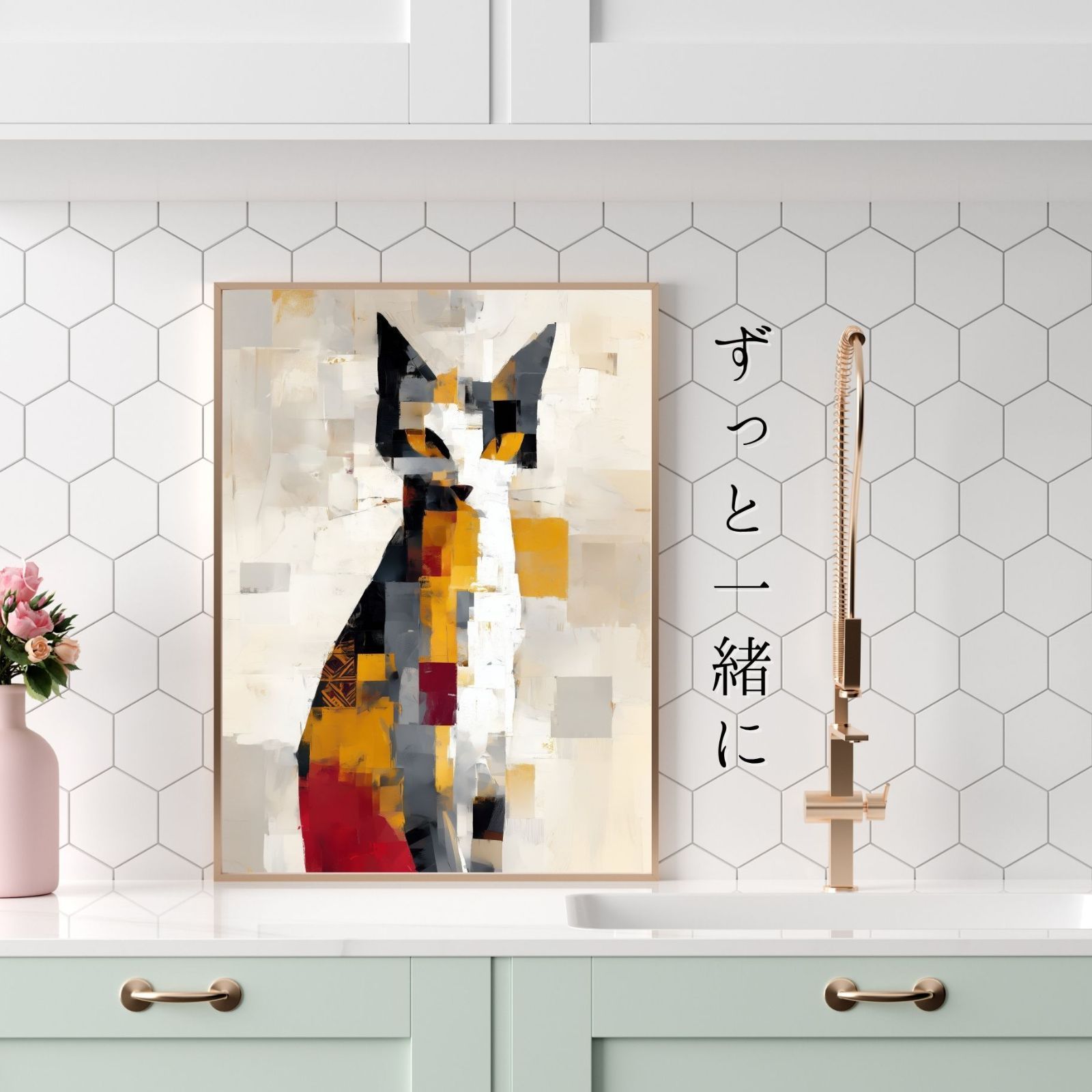 モダンな空間にぴったりなこのアートポスターは、愛らしいミヌエットキャットを大胆なキュービズムと抽象表現で描いた一枚です。