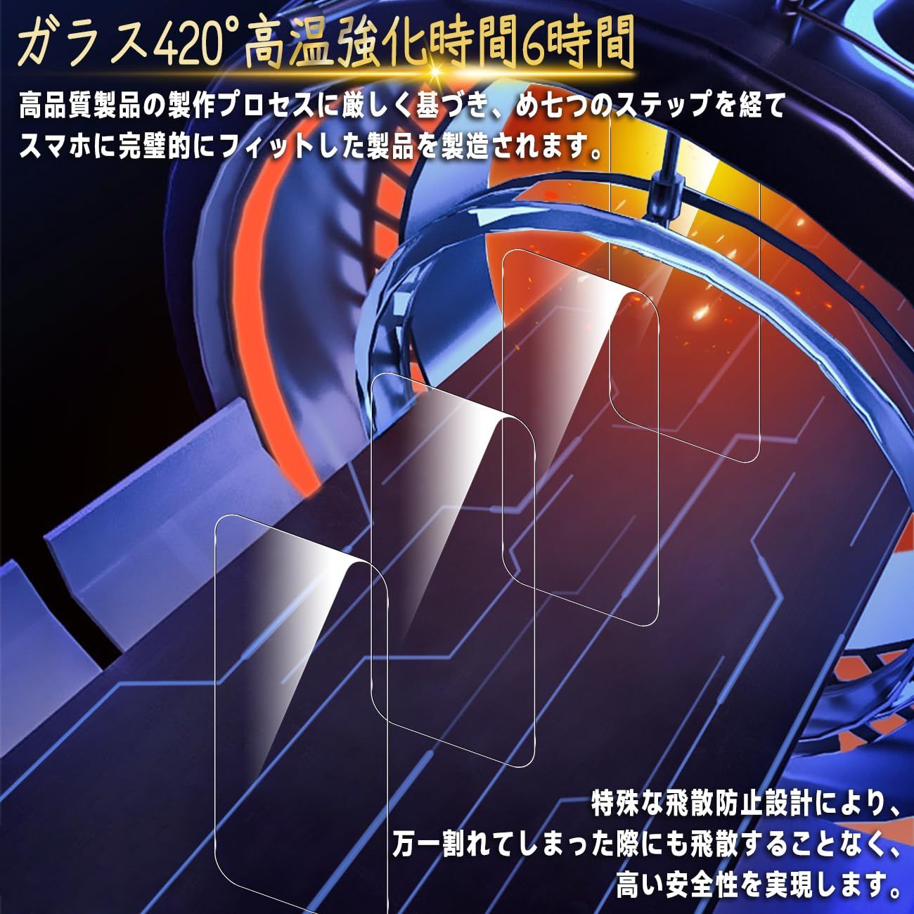 【高品質の材料の9H硬度】とレンズ保護フィルムはすべて旭硝子で作られており、スマホ保護フィルムの中で最高レベルの9H硬度に達しています、4.5時間以上の高温焼入れ処理を行い、スクリーンプロテクターの圧強度は 125mpa に達し、通常 ガラス の 5 倍になりました。しかもスクリーンプロテクターは衝撃を抑えるシリコンコーティングを内蔵しており、万が一ガラスが割れても、ガラスの破片が飛散しません。ハードコーティング技術は、衝撃を最小限に抑えて画面の破損を抑え、すり傷防止や指紋防止もしっかりとスクリーンを保護します。*大切な携帯電話の液晶画面を保護し、衝撃や表面のキズを防止します。