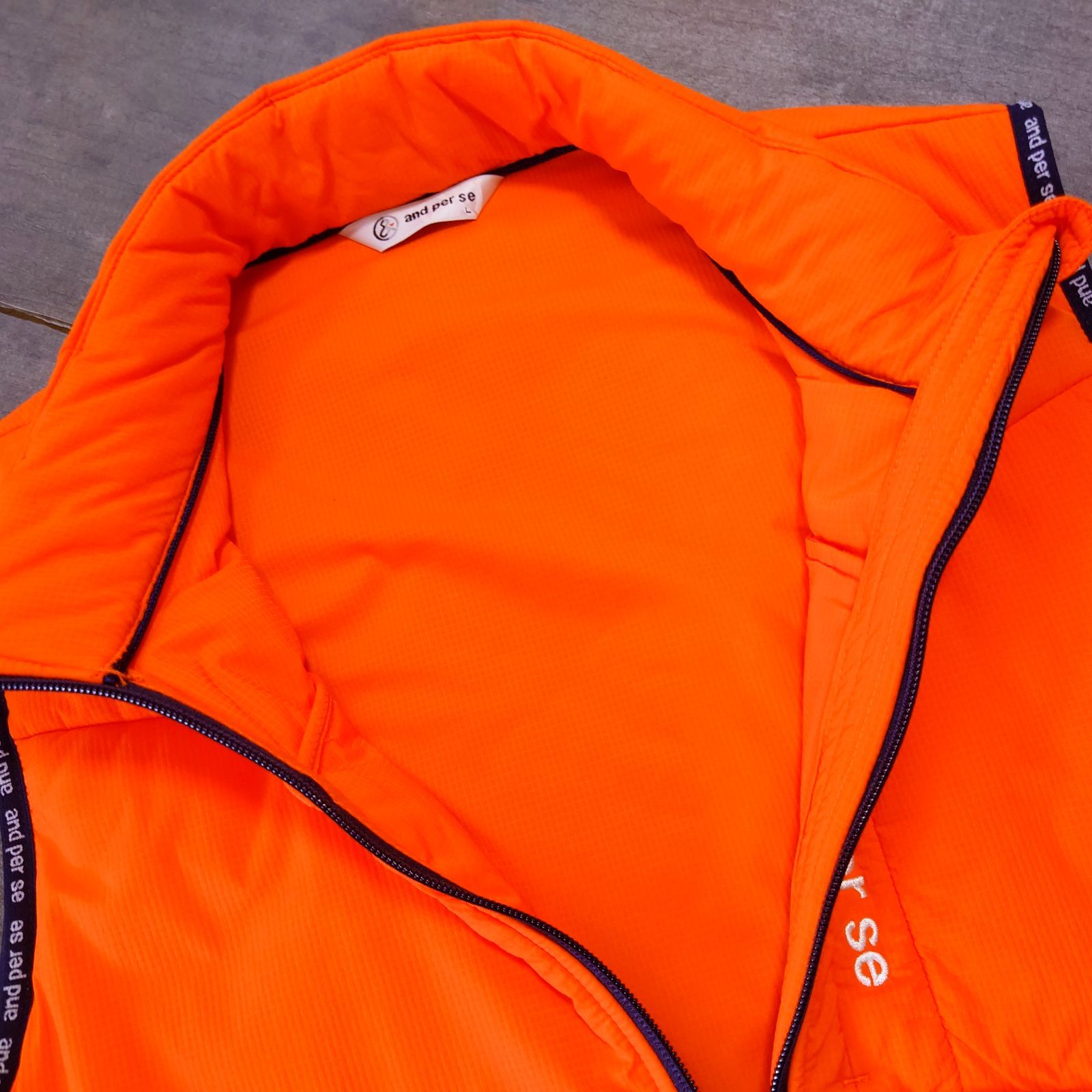◆and per se◆アンパスィ◆アンパスイ◆golf◆ゴルフ◆ゴルフウェア◆ゴルフベスト◆ゴルフアウター◆中綿ベスト◆ダウンベスト◆ストレッチ素材◆メンズウェア◆ユニセックス◆デカロゴ◆両面ロゴ◆刺繍ロゴ◆エンブレム◆マルチロゴ◆ロゴテープ◆パイピング◆オレンジ◆