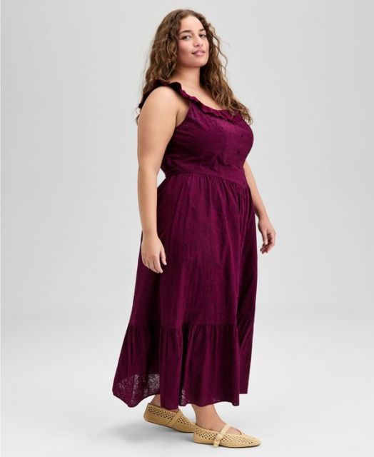 アンドノウディス レディース ワンピース トップス Women s Cotton Ruffle-Trim Scoop-Neck Voile Maxi Dress P|XXS-4 X Deep Cranberry