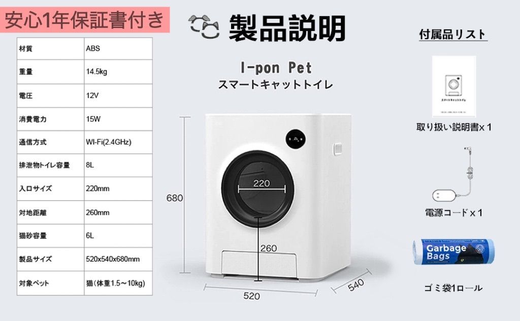 【大容量&消臭・快適生活】 ゴミ箱:8L、ゴミ箱容量が満タンになると赤外線センサーが感知しスマホアプリ内にお知らせが届きます。 旅行や出張などで長時間留守の場合でも、いつでも・どこでも、状況を確認するとこができるハイテク猫トイレです。