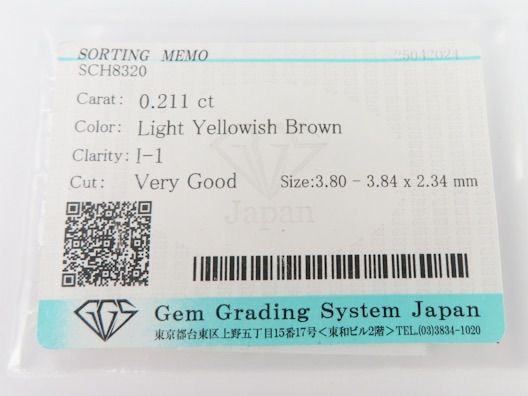 ソーティングメモ付き K 18 YG ダイヤモンド 0.211 ct トップ|Light Yellowish Brown|Very Good|ソーティング付き