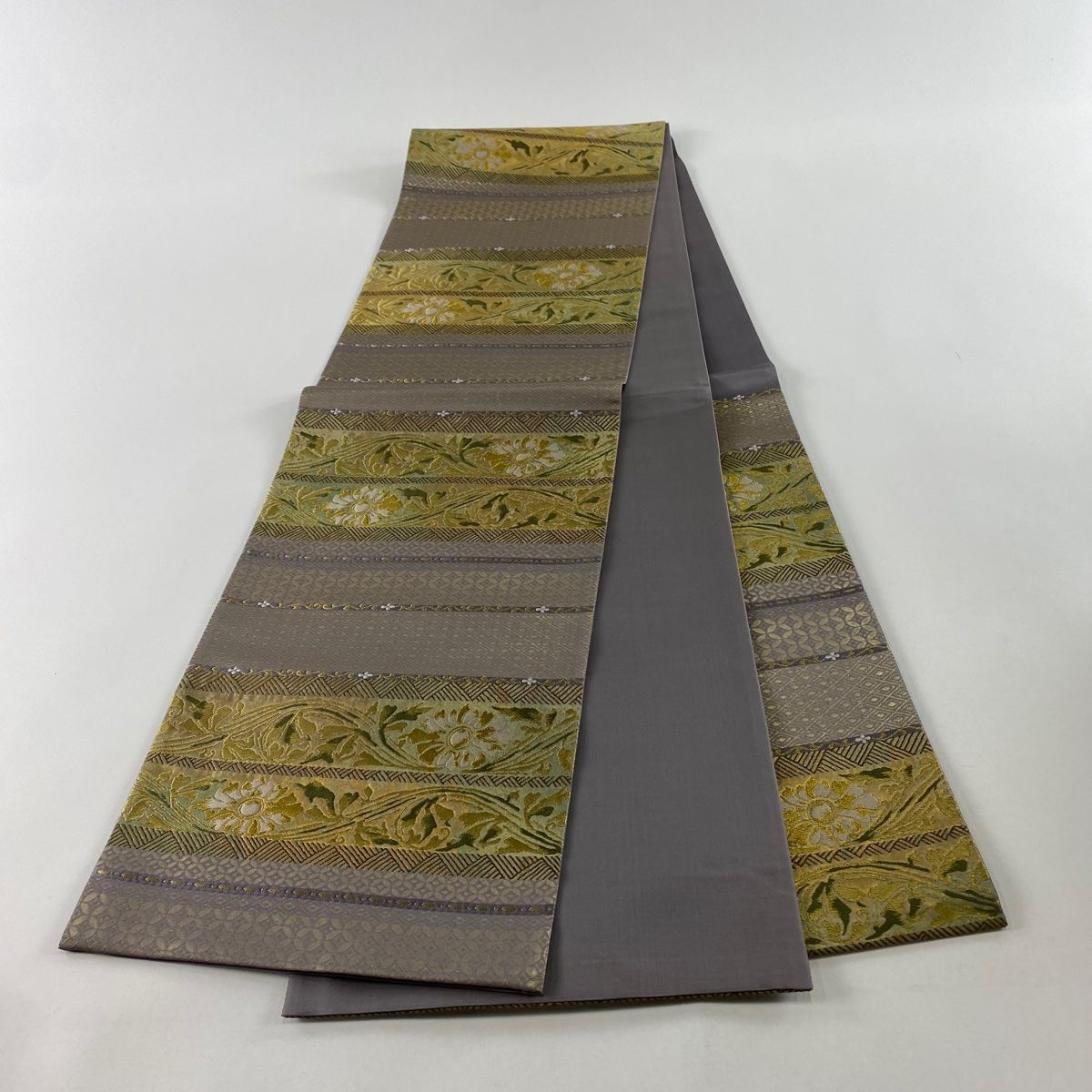 袋帯 秀品 草花 段縞 箔 金糸 灰紫 六通 正絹