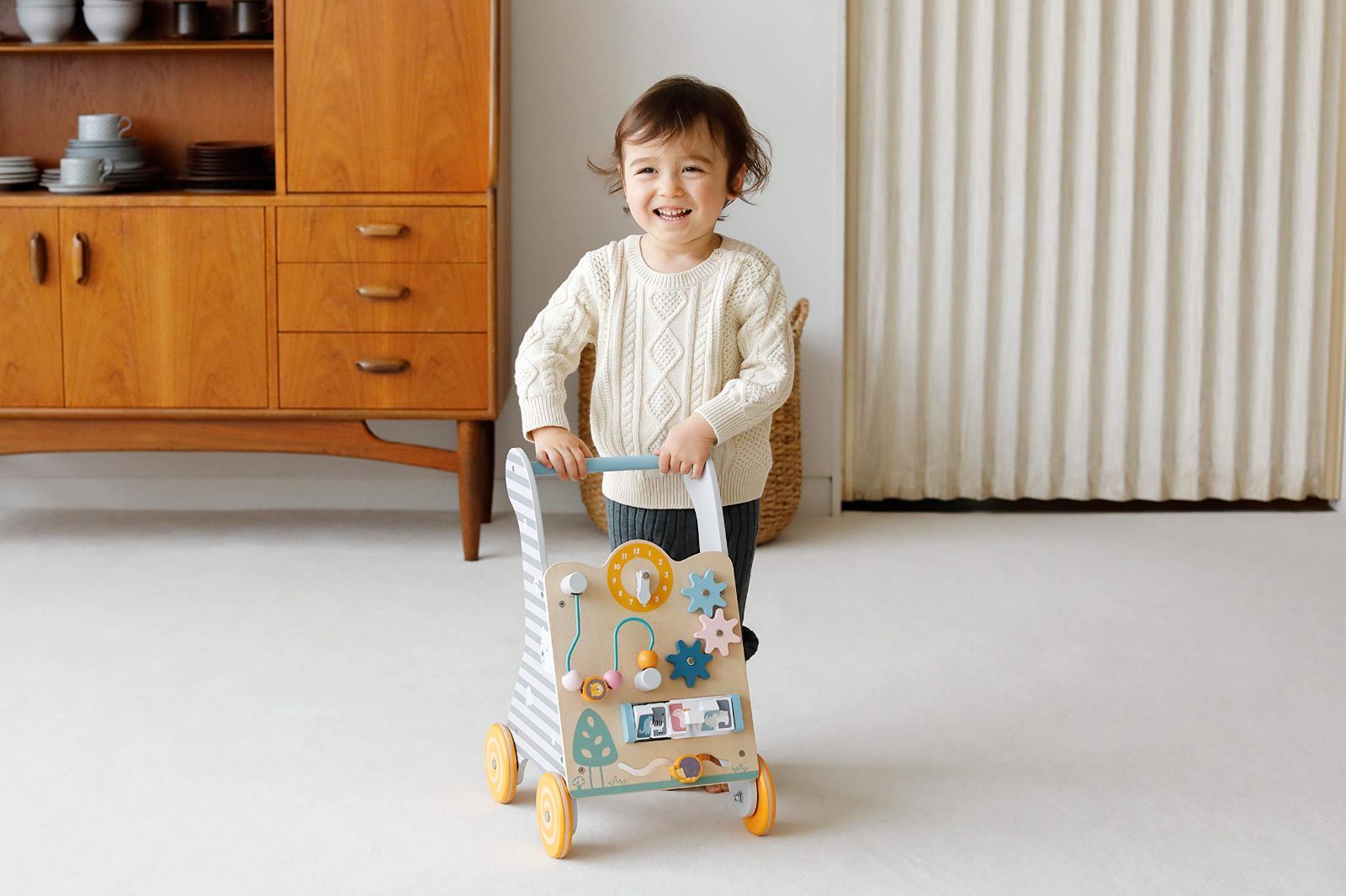 たくさんのしかけが楽しめるベビーウォーカー。木製ビーズや歯車をうごかしてみたり、絵合わせで遊んだり。歩き始めのお子様におすすめです。