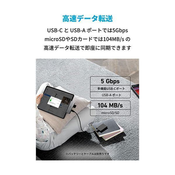 ●データ転送用のUSB-Aポート(最大5Gbps)、microSD&SDカードスロット(最大104MB/s)から高速データ転送を実現。音楽のプレイリストやフォトアルバムなどを即座に同期することが可能です。
