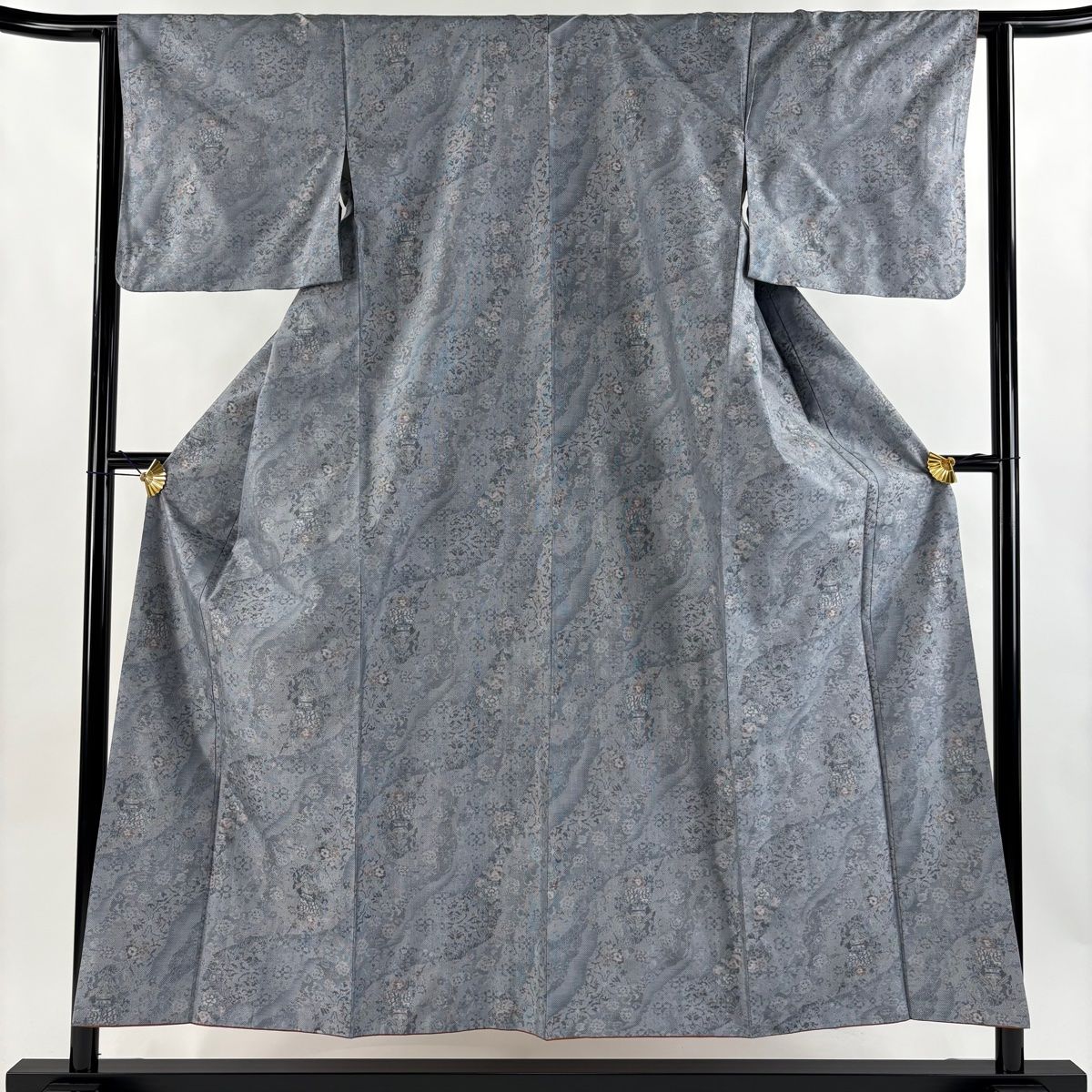 大島紬 身丈153.5 cm 裄丈62.5 S 袷 都喜ヱ門 証紙 草花 霞 青灰色 正絹