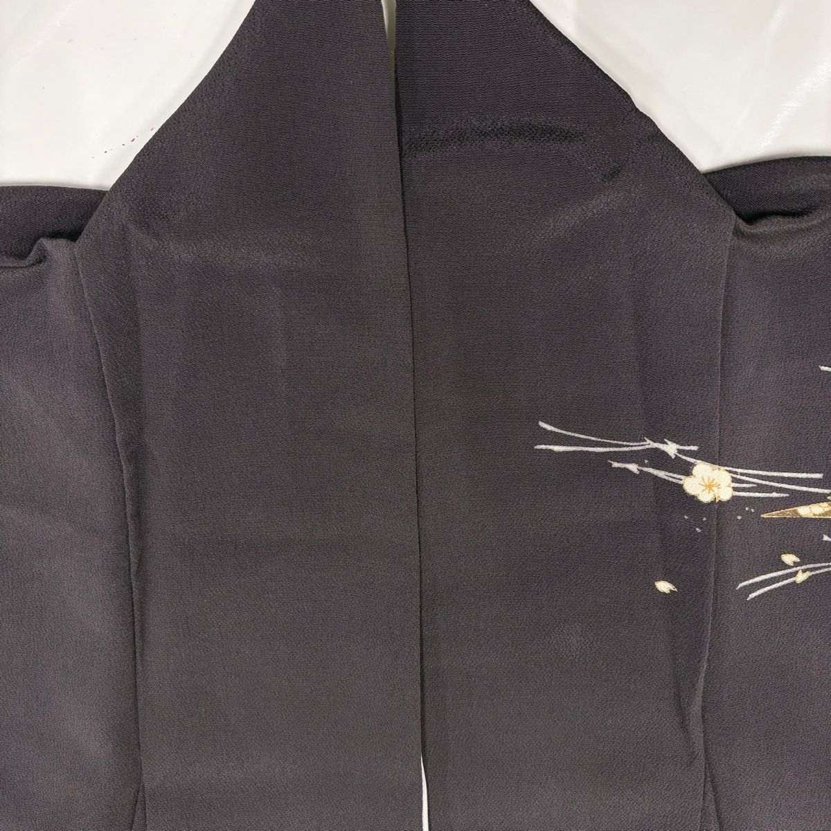 表地所々にヤケ、左衿にシミ、表地所々に薄いシミ、衿周りや両袖口中に汚れ、表地所々にシワ、表地所々に金彩の変色がございます。